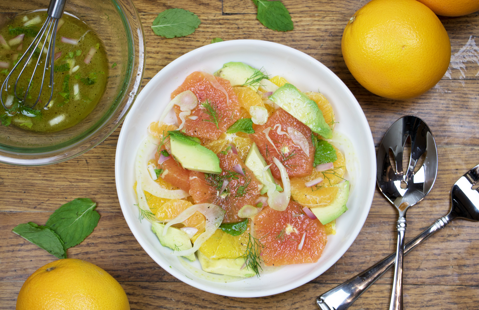- Pour dressing over salad and season with salt and pepper. Garnish with mint leaves and fennel fronds.