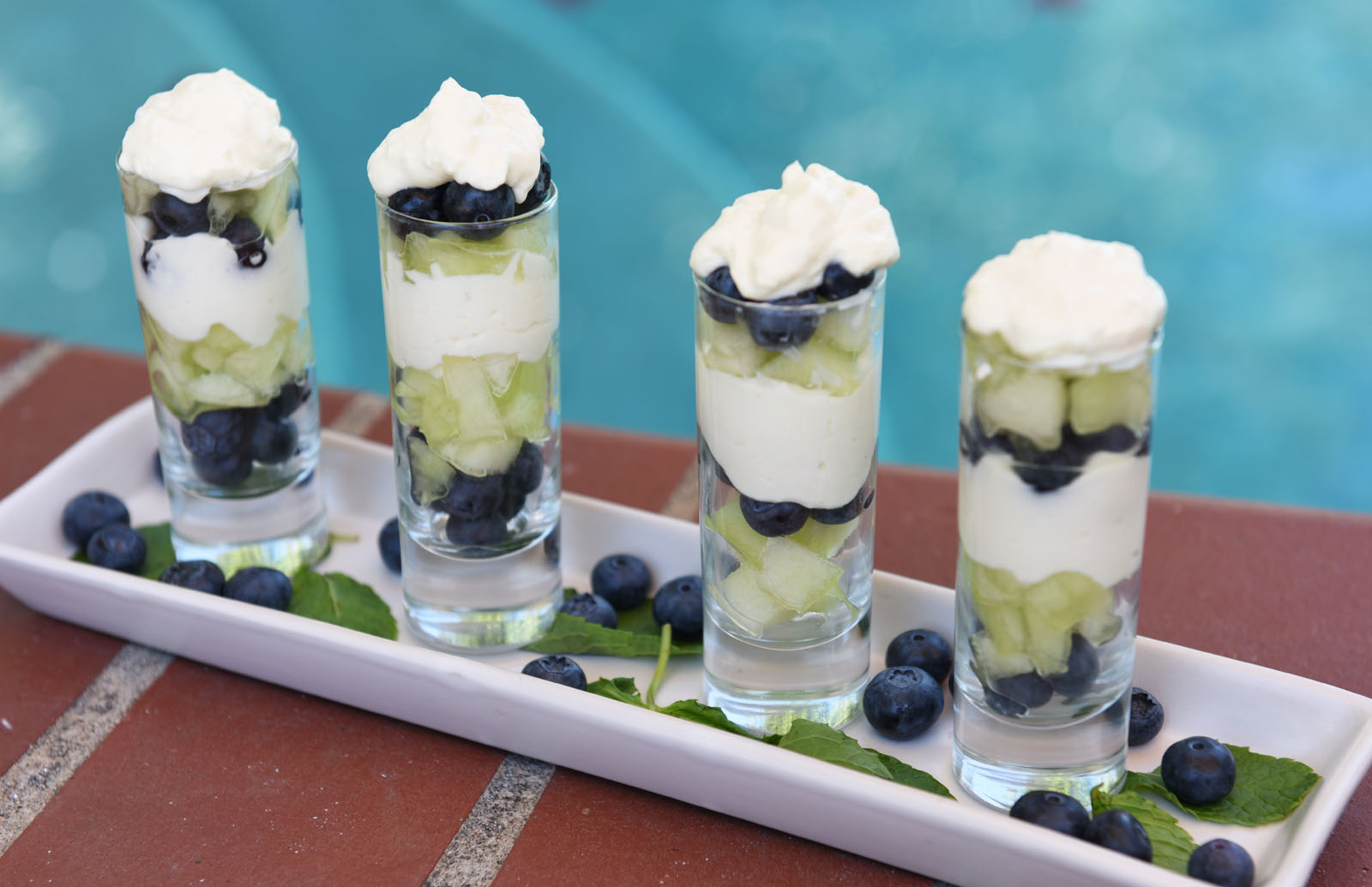 Add the melon cubes to the shooters by layering with some of the mixed cream, then blueberries, more melons and top with more cream. You can layer as you like!