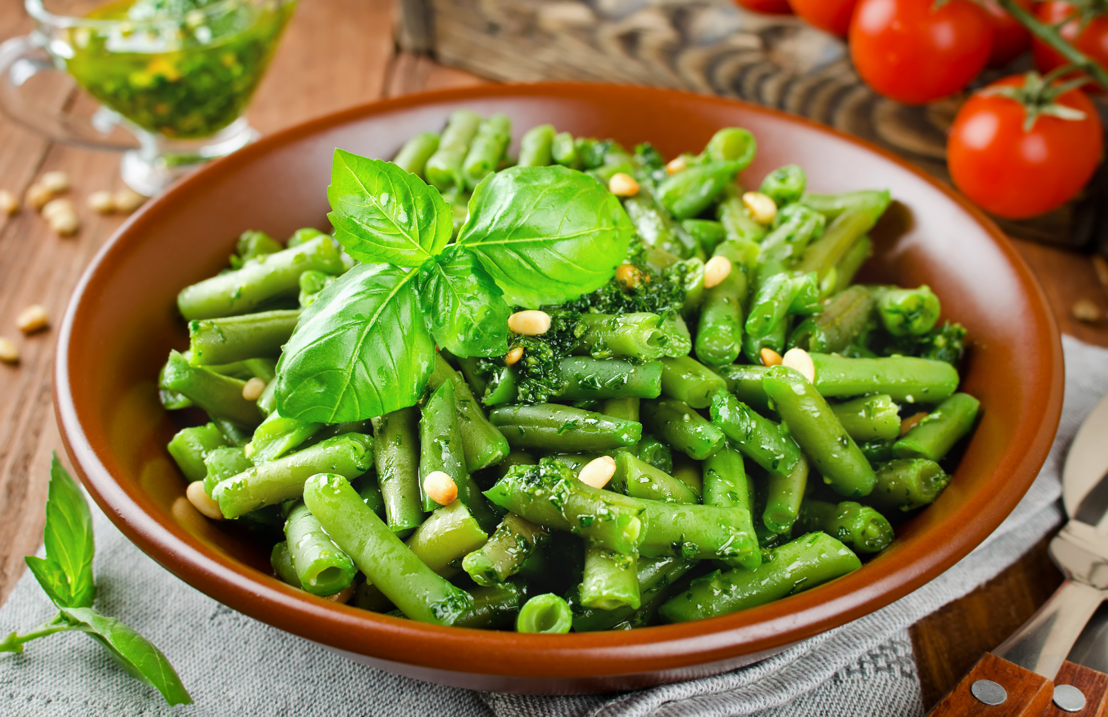 Combine the green beans and pesto – toss them in a pan to heat them up.