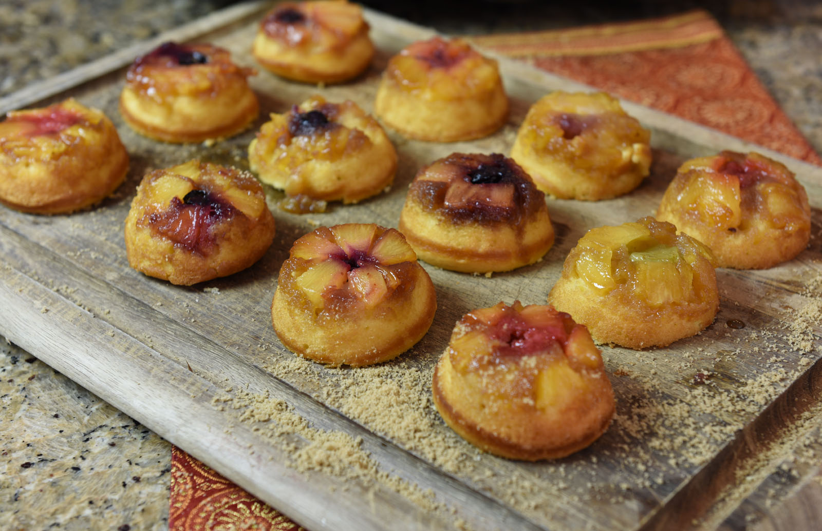 - Place the diced pineapple in a circle over the butter/sugar mixture. Place a blueberry, raspberry, grape, or cherry in the center of each cup.