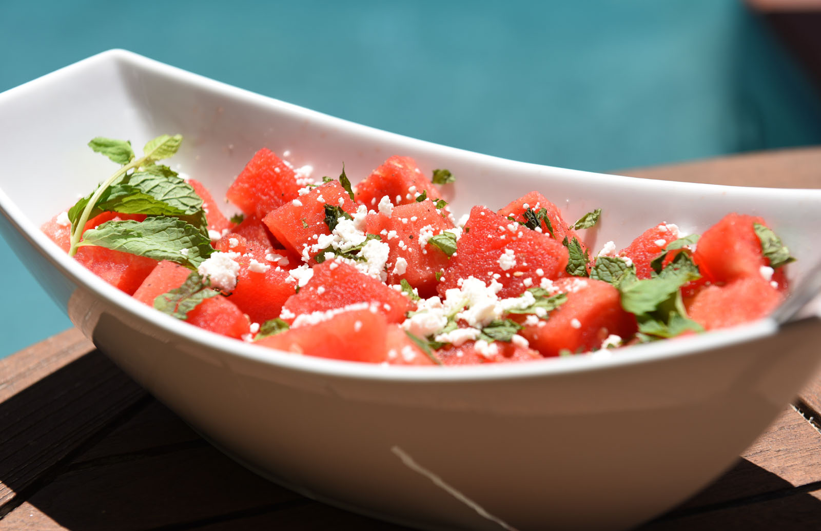 - Place watermelon in a large bowl. Add feta cheese crumbles, black pepper, fresh lime juice, and chopped mint to taste. Mix together and enjoy on a hot Summer day!